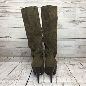 High heel stilettos, approximately 3”. NARROW shaft fit. Zips up to mid way as displayed in pictures above. 14”-15” in circumference calf width. Suede/faux fur. Medium width fit in foot area & round toe design.