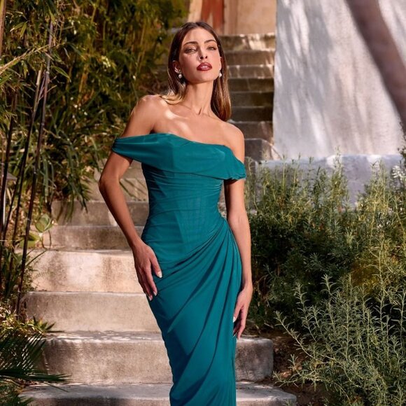 New Teal Sheath Off Shoulder Evening Gown w/ Boned Bodice & Lace Up Back CD387