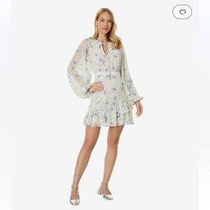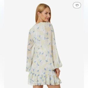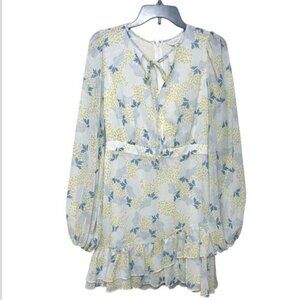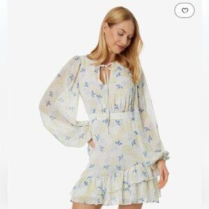 Tags: mini dress, ruffled, long sleeve, fit & flare, romantic dress, floral print, business, casual, party, wedding guest.