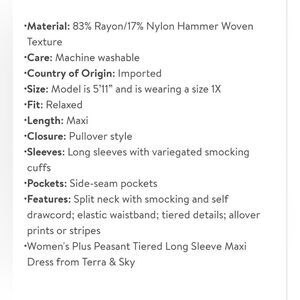 New Terra & Sky Dress Peasant Tiered Long Sleeve Maxi Tuscan Rose Plus Size