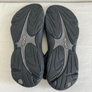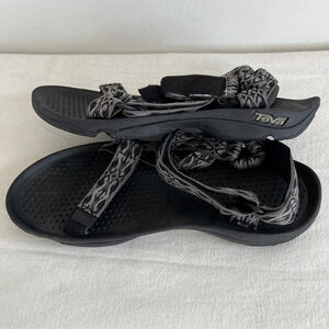 New Teva Original Universal sandals in black and gray. The sandals feature adjustable straps with a flame-like pattern, a black rubber sole with a textured pattern, and a comfortable footbed. They are made of durable materials and show no signs of wear. The sandals come with original tags and are in their original box. Approximate dimensions are standard for women's size 8, but please check the tag for exact sizing. No imperfections are visible.