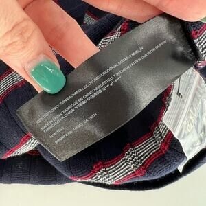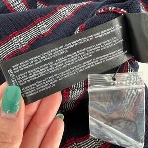 The Fifth Label Gravitation Striped Long Sleeve Lightweight Sweater in Navy Blue. New with tags. Gravitation ribbed navy blue, white and red stripes. Crewneck, long sleeves, semi-cropped fit. The fabric and care tag is pictured for your reference.