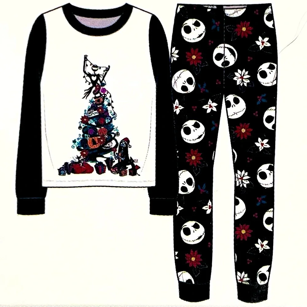 - 2-piece fleece pajamas with all over Santa Jack Skellington faces on pants and Jack and Sally decorating the tree on front chest