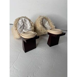 New The Tory Burch Kaku Block T Shearling Mule Sandal Buttermilk/ Brie Sz 8 $398