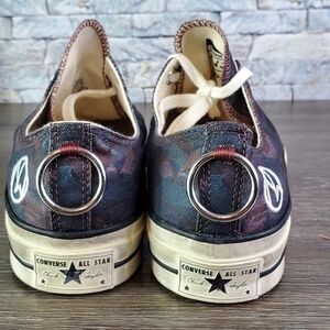 The Undercover x Converse Chuck 70 Ox “Camo” is part of the “New Warriors” collection designed by Jun Takahashi to represent the contrasting style tribes of cult-classic ‘70s films. Undercover's signature avant-garde aesthetic is featured prominently on the low-top silhouette as a dusty camo pattern covers the entire upper and is contrasted by an embroidered “Nw” patch on the heel.