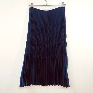 Theory midi skirt featuring a high-rise, fixed waistband, side zipper closure, unlined interior, polyester shell, and intricate accordion pleats that are inverted in a pattern. Cool and unique! Classic navy blue color called High Tide.