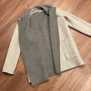 Brand new, never worn, no tags. A dependable throw-on-and-go layer for workdays and weekends alike, this Theory coat has a boxy, unstructured silhouette and is crafted from cashmere-infused felt. Double face, spread collar, notch lapels, open front. Collared neck and open placket. Crafted with our signature double-face wool-cashmere. Soft, mid-weight fabric. Relaxed fit, long sleeves. Mid-length profile. Exposed seams. On-seam side pockets on cream side, large square patch pockets on gray side. 90% wool, 10% cashmere. Size S. G15.