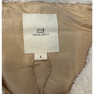 Stay cozy and effortlessly stylish in this Thread & Supply sherpa lined vest in a soft light tan shade that pairs beautifully with just about everything. Designed for easy layering, this vest features a plush sherpa lining that adds warmth and comfort without feeling bulky, making it perfect for crisp mornings, cool evenings, or casual everyday wear. Size Large and in excellent pre owned condition with no rips, stains, or tears, this versatile piece is a feel good wardrobe essential that brings cozy charm and relaxed style wherever you go.