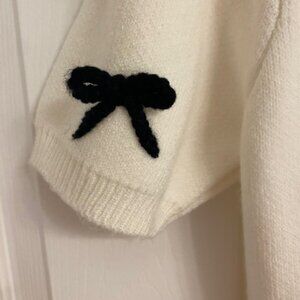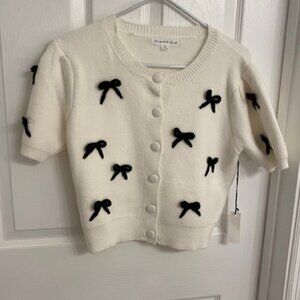 This charming cardigan from Threaded Leaf features a playful black bow pattern on a white base, offering a whimsical touch to your wardrobe.