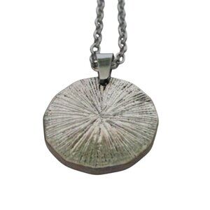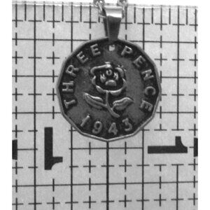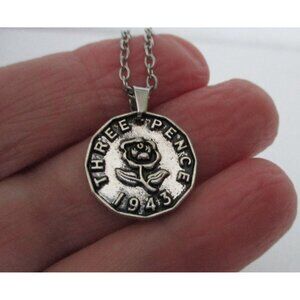This pendant necklace features a replica of a 1943 Three Pence coin with intricate detailing. It is a timeless accessory for collectors or history enthusiasts.