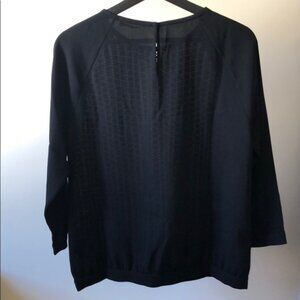 Brand new, never worn, no tags. Tibi mixed-media blouse featuring exquisite guipure lace front panel body with simple solid sleeves and trim. Roundneck, 3/4 length sleeves, floral applique at bodice. Smooth silky body, sleeves end in elegant banding. Keyhole snap closure at back, semi sheer material at arms and back. Temper the sheer front with a nude slip. Size S. S8.