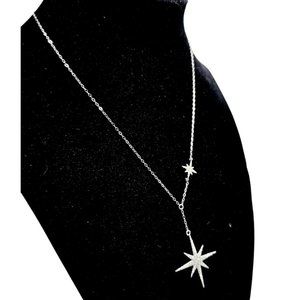 This elegant Tocara necklace features a large and small starburst pendant adorned with DiAmi crystals, ideal for adding a touch of sophistication to attire. Made in Canada.
