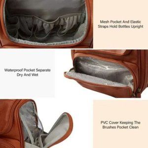 The elastic straps and mesh pocket to keep the bottles stand upright, avoiding leakage, the waterproof front pocket separates the dry and wet item, recommend to storage the wet towel, 2 side zipper pocket for makeup brushes and small accessories
