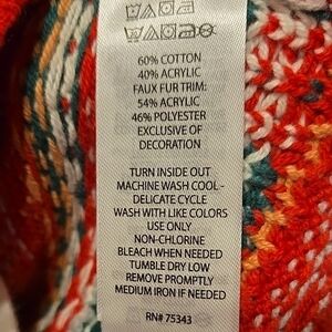 Adorable red knit dress with festive patterns. Features faux fur trim and pom-pom detail. Includes matching tights and shoes.