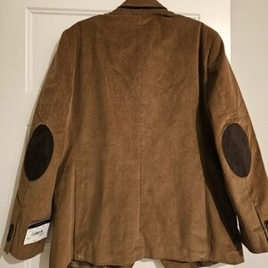 Brand New Carmel Color Tommy Hilfiger Men's Corduroy Blazer with Two Button Closure, Two Front Pockets, Four Accent Buttons on the Back of Each Sleeve, and Chocolate Brown Elbow Patches. Can be Worn with Jeans or Dress Attire.