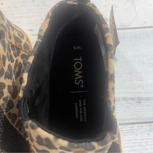 TOMS Bryce Mid Top Suede Sneakers for women in a size 5 US (3 UK). The shoes feature a round toe shape with a slip-on closure for easy wear. They are designed with a tan and brown leopard animal print pattern on suede material, providing a stylish and trendy look. The sneakers are crafted with comfort in mind, featuring cushioned Ortholite insoles, making them suitable for travel, activewear, or casual everyday wear during the winter, summer, fall, and spring seasons. Colors may vary due to lighting, NEW WITH TAG, NO BOX