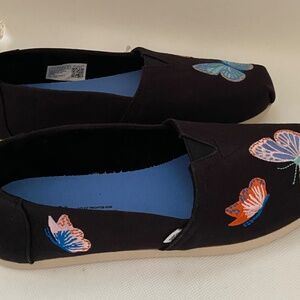 New in box, Toms canvas navy blue flats embroidered with colorful butterflies. With Ortholite insoles.
