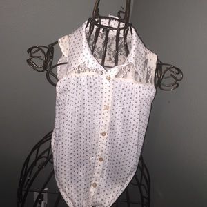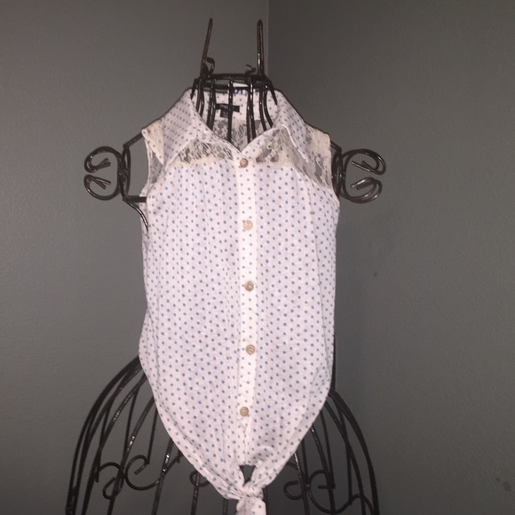 Top is Beige with Light Blue Polka Dots Sleeveless Top with Tie bottom