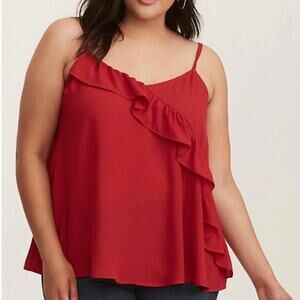 Brand new Torrid Georgette asymmetrical ruffle cami in women's size 5 or 5X 28. Adjustable shoulder straps. 100% polyester. Machine washable. New with tags!