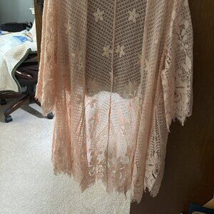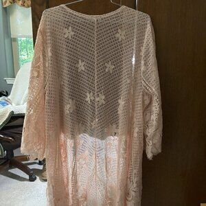 Very pretty pink lace kimono from Torrid size 1-2. Material is 65% cotton and 35% nylon. It is machine washable gentle cycle dry flat. Very light weight.