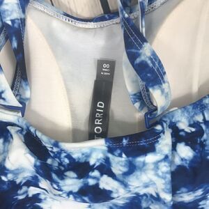 New Torrid Blue Tie Dye Bikini Top Sz 10 38 bust Has a layer over the bra. Adjustable straps. lined bra. Gently used/EUC Questions? Leave a comment below!