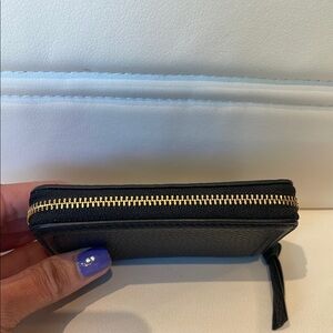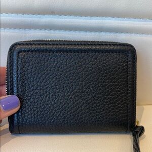 Chic black Tory Burch leather wallet with embossed logo. Secure zip closure. Sleek and stylish design.