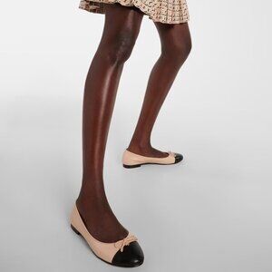 A classic ballet flat crafted in fine leather is finished with a contrast cap-toe and embellished with a bow. A subtle Double T initiates the elegant style as a new brand signature.