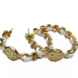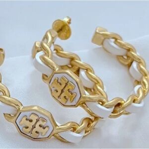 New Tory Burch Marion Woven Chain Link Hoop Earrings; White/Gold