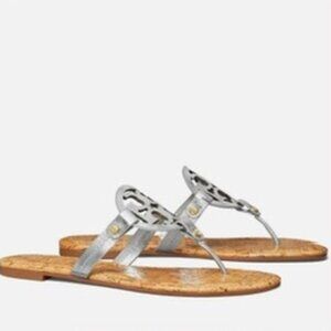 New Tory Burch Metallic Silver Patent leather Cork Miller Sandals Size 8.5