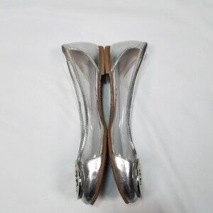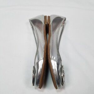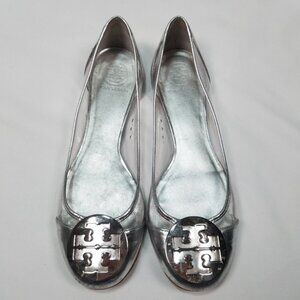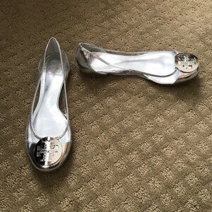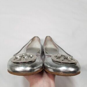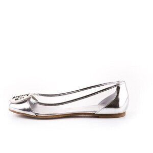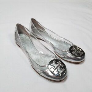 Brand new, never worn, no box. Limited edition Tory Burch Reva Audrey rare patent leather clear lucite PVC silver metallic contrast logo ballet flat. Clear body and silver heel and caps with signature Tory logo medallion. Clear PVC side panels, signature double T Tory Burch logo medallion, side ventilation holes. Some minor closet wear and scuffs from sitting in my closet. Non-slip rubber sole with Tory logo stamped across the bottom. Size 6.5. Box BB.