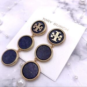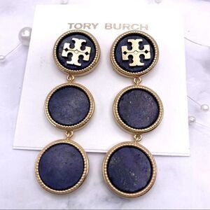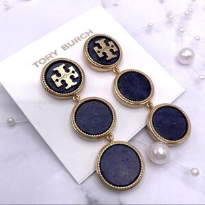 New Tory Burch Gold Logo, Dark Blue Round Drop Dangle Stud Earrings