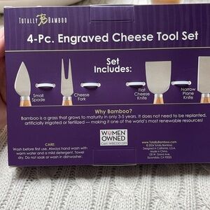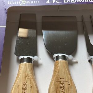 New unused unopened Totally Bamboo 4 pc Engraved Cheese Tool Set Stainless blades Bamboo handles. Handles engraved with Pennsylvania and outline of state