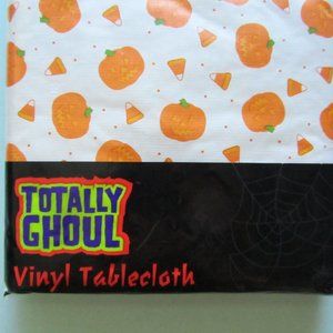 For sale is New Totally Ghoul Pumpkin Motif Thanksgiving Oblong Vinyl Tablecloth 52” x 90”.