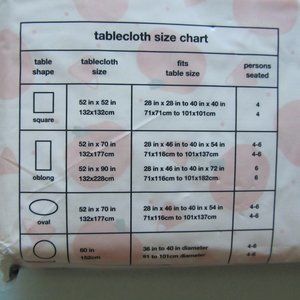 Proper drop for casual settings is 6” – 8”. Tablecloth size chart & care instructions are on the back of the package.