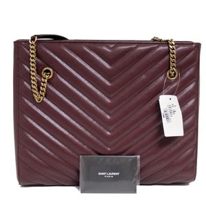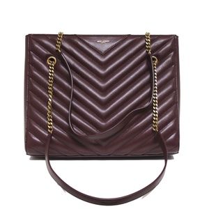 Structured shopper boasts elegant curb chains and chevron quilting.