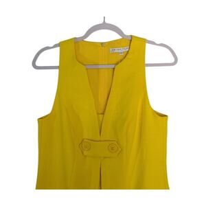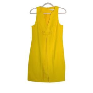 The product is a stylish Trina Turk Lemon Yellow Torch Shift Dress in US size 2. This sleeveless dress features a V-neckline and a solid yellow color, making it perfect for parties, cocktails, or casual occasions. The dress is made from a blend of polyester, spandex, and cotton, with a woven fabric type, and has a knee-length hemline. The shift style offers a flattering and comfortable fit for any woman looking for a chic and vibrant dress option.