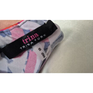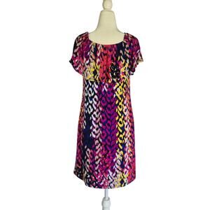 The product is a new Trina Turk multicolor geometric off-the-shoulder mini dress in size small. This dress features a fun and stylish pattern, with a flattering off-the-shoulder neckline and ruffle accents. Made from a stretchy polyester and spandex blend, this dress is perfect for both party/cocktail and casual occasions during the summer and spring seasons. Easy to care for with its machine washable fabric, this dress is a stylish choice for women looking for a trendy and comfortable outfit.
