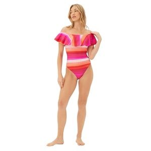 New! Trina Turk Solstice Off The Shoulder Ruffle Striped One Piece Swimsuit