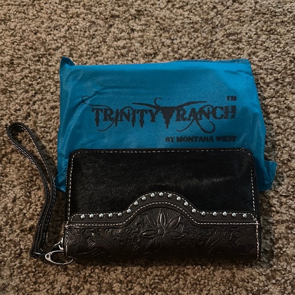 New with dust bag Trinity Ranch Wallet Wristlet with black hair calf and stud details