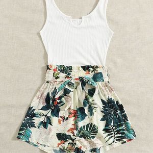 New Tropical Print Tie Front Romper White Green 226