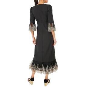 You loved it in velvet, so we are bringing back the Black Lillith Dress in a new material. This magnificent maxi has all the glam touches you could want — shirring at the shoulders to create a slight puff, flattering princess seams, and gold embroidered lace at the sleeves and skirt hem for a vintage-inspired feel. A look suited for events and occasions, this elegant and elevated silhouette pairs well with heels, a clutch, and a glass of bubbly!