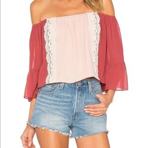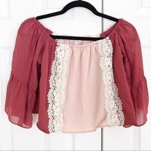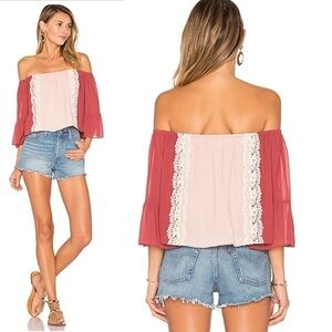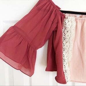 New with tags off the shoulder top with lace detail. Elastic neckline and semi-sheer sleeves. Please see photos for measurements and additional details. 💕