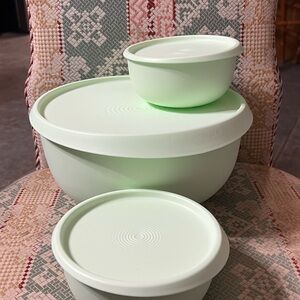 New Tupperware Bowls, two 4.3 L bowls with lids and four 2 1/4 cup bowls with lids. Lids have a lip on them to assist with taking the lid off the bowl. 6 items in a light green color and six items in a darker greenish color.