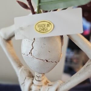 Add a quirky touch to your decor with this skeleton planter featuring vibrant green leaves. Perfect for Halloween or year-round fun.