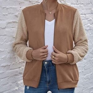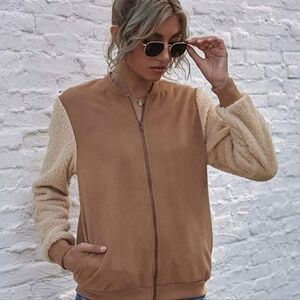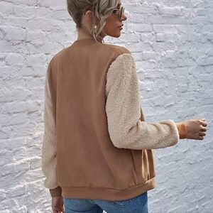 Chic two tone lightweight jacket. Features a lighter shade teddy material on the sleeves, slant pockets & a relaxed fit.