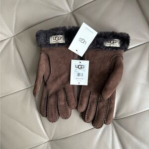 New UGG Women's Tan Suede Gloves with Fur Trim and Bow