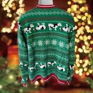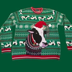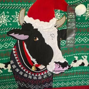 New Ugly Christmas Sweater Embroidered Cow Wearing Santa Hat Bell Green Size L