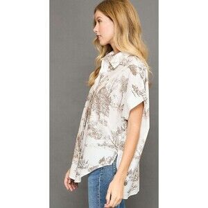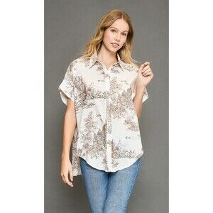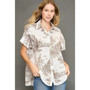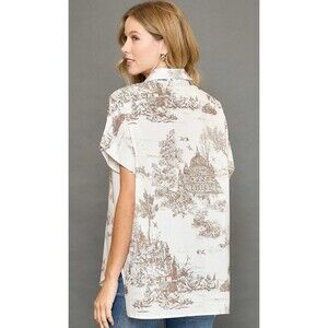 New Umgee S M L Latte Cream Victorian Mansion Toile Cotton Button Front Top
