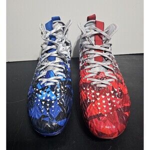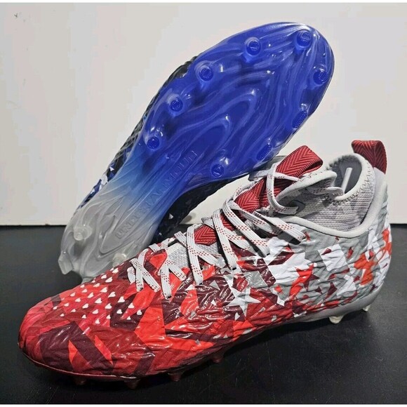 Elevate your game with these Under Armour UA Spotlight Clone MC LE athletic shoes. Designed for men, these sneakers feature a blue-red color scheme with a USA theme, perfect for activewear occasions such as football season. The shoes are made with synthetic upper material and a plastic cleat type, ensuring durability and comfort on the field.