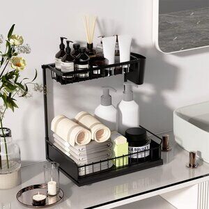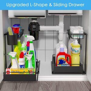 ELEVATED L-SHAPED DESIGN: Gracenal 2-tier kitchen under sink organizer with a sliding drawer's dimensions are 10.63" W x 14.51" D x 14.76" H. Its L-shaped design ensures it avoids sink pipelines and garbage disposals, and its heightened sticks and sliding drawer make it perfect for storing tall bottles in the bottom basket. With plenty of space for your belongings, our kitchen organization and storage is a great addition to any room.